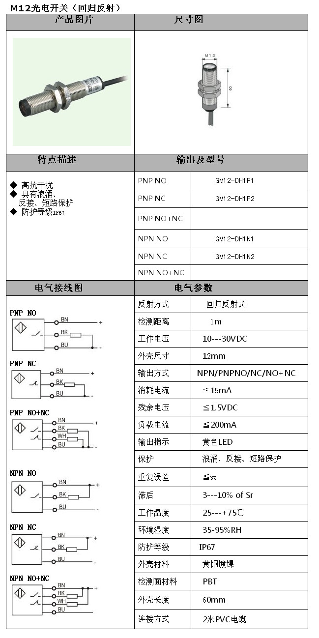 GM12-DH1P1,GM12-DH1P2,GM12-DH1N1,GM12-DH1N2,M12光電(回歸反射)