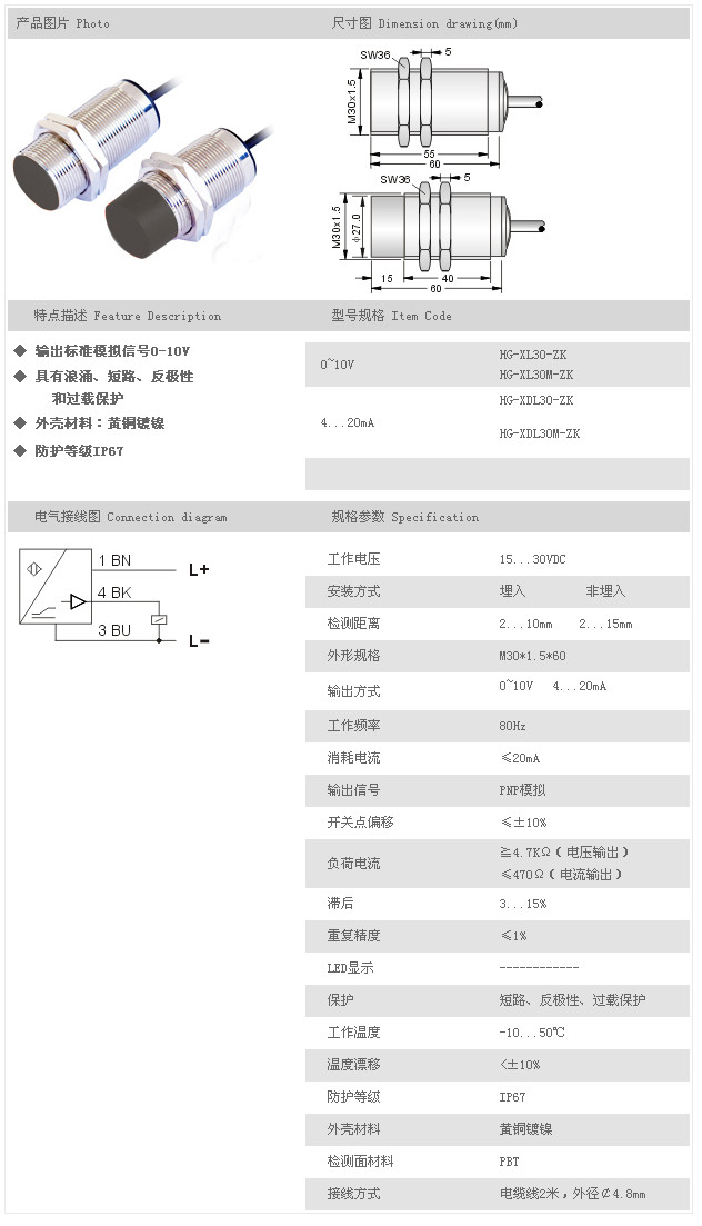 電感式線性傳感器 HG-XL30-ZK,HG-XL30M-ZK,HG-XDL30-ZK,HG-XDL30M-ZK,