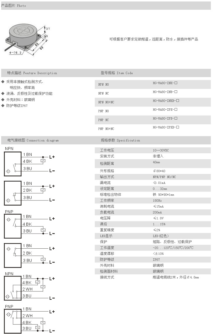 耐高溫接近開關(低溫) HG-WA80-ZNK,HG-WA80-ZNB,HG-WA80-ZNKB,HG-WA80-ZPK,HG-WA80-ZPB,HG-WA80-ZPKB,