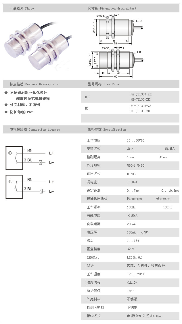 金屬探頭型接近開(kāi)關(guān) HG-JSL30M-ZK,HG-JSL30-ZK,HG-JSL30M-ZB,HG-JSL30-ZB,