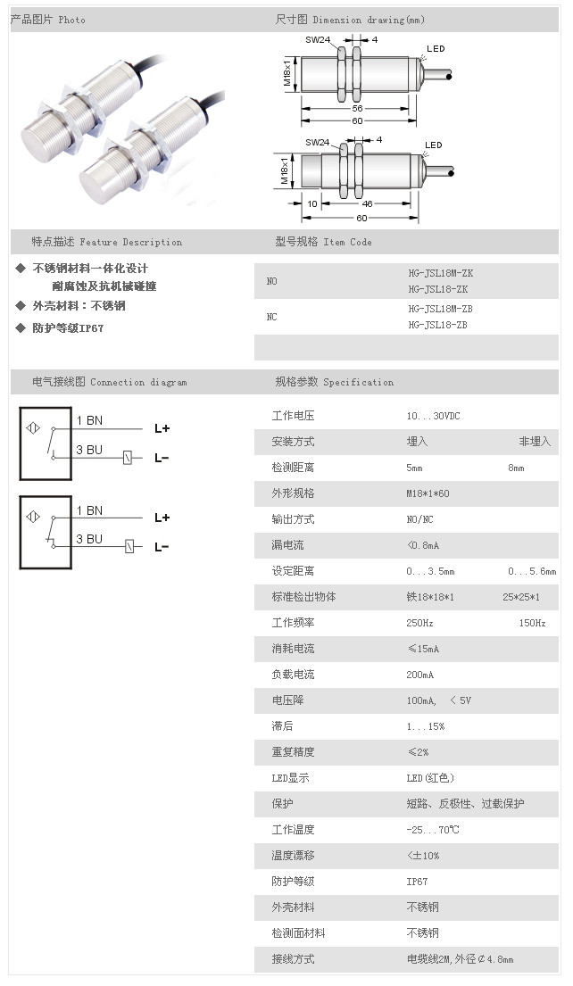 金屬探頭型接近開關(guān) HG-JSL18M-ZK,HG-JSL18-ZK,HG-JSL18M-ZB,HG-JSL18-ZB,