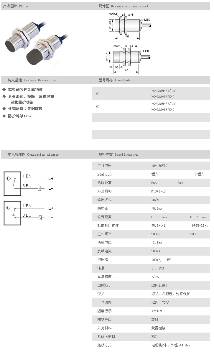 圓柱型接近開關(guān) HG-L18M-ZK/C40,HG-L18-ZK/C40,HG-L18M-ZB/C40,HG-L18-ZB/C40,