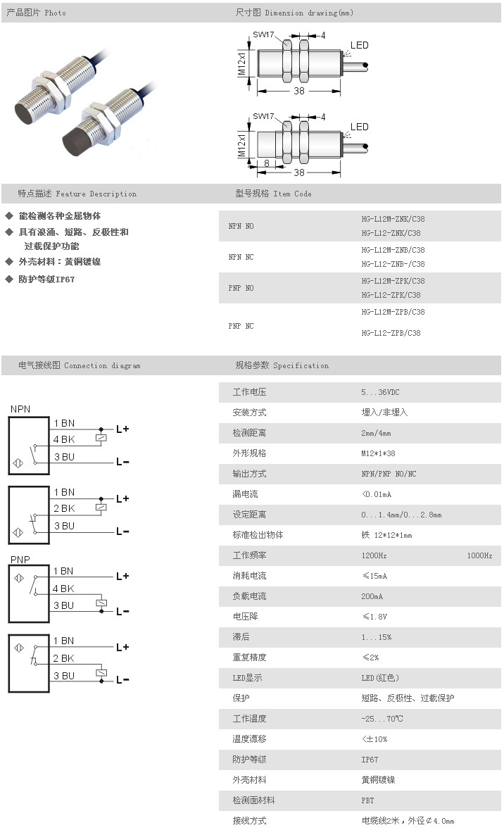 M12短圓柱型接近開(kāi)關(guān) HG-L12M-ZNK/C38,HG-L12-ZNK/C38,HG-L12M-ZNB/C38,HG-L12-ZNB/C38,