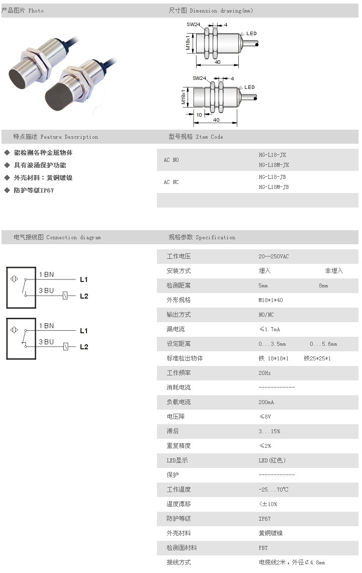 L18短圓柱型接近開關(guān) HG-L18-JK,HG-L18M-JK,HG-L18-JB,HG-L18M-JB,