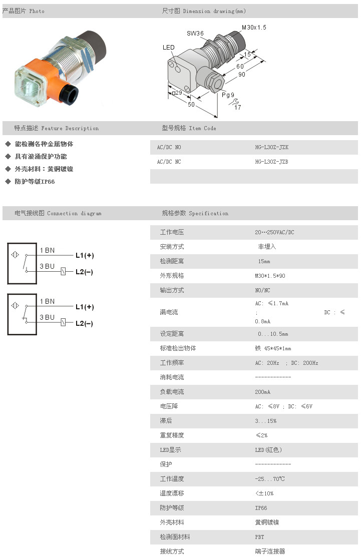 L30Z圓柱型接近開(kāi)關(guān) HG-L30Z-JZK,HG-L30Z-JZB,