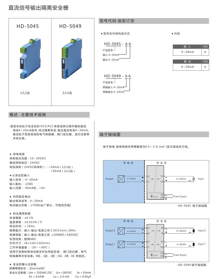 HD-5045-AA,HD-5049-AA,HD-5045,HD-5049,直流信號(hào)輸出隔離安全柵