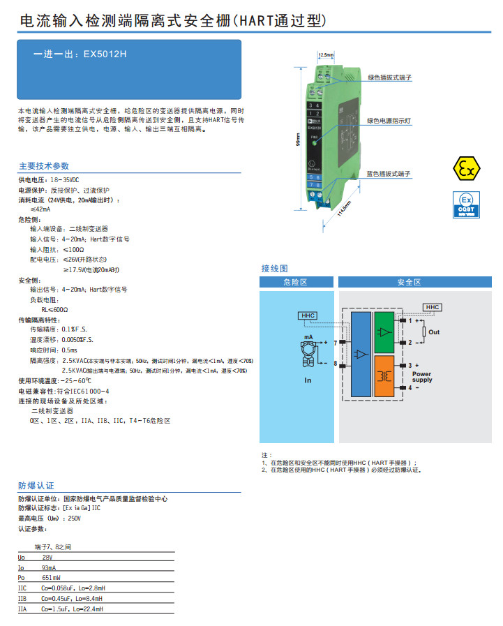 EX5012H,電流輸入檢測端隔離式安全柵(HART通過型)