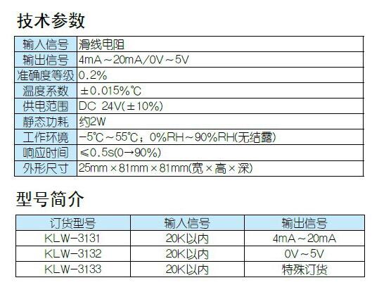 型號(hào): KLW-3131,KLW-3132,KLW-3133,KLW-313,滑線電阻輸入信號(hào)隔離處理器