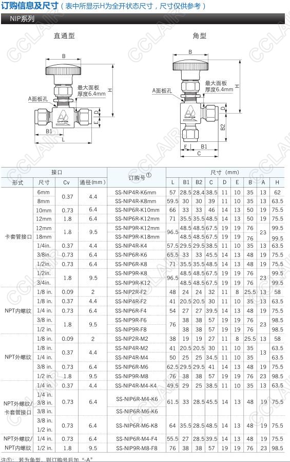 SS-NIP2R-M4-K6-A-SH-P,SS-NI3V-F4-K6-A-SH-P,NIP和NI帽式針閥—不銹鋼管閥件帽式針閥閥體為整體鍛造,結構設計精巧,工作可靠,可用于多種場合的流量調節(jié)及切斷。結構緊湊自動補償式填料密封結構調節(jié)閥桿及V形閥桿可供選擇可面板安裝