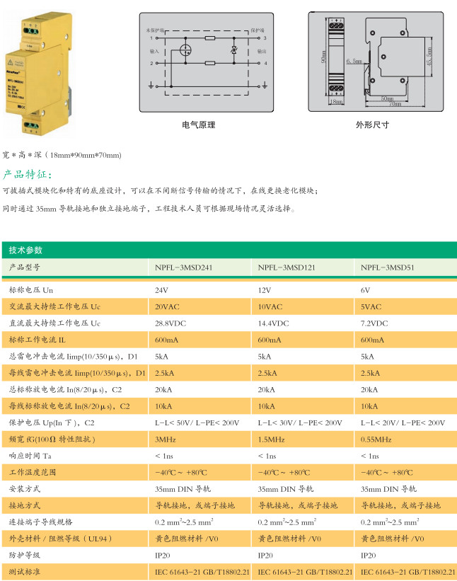 NPFL-3MSD51,NPFL-3MSD121,NPFL-3MSD241,二線制通用型信號浪涌保護器(浮地)