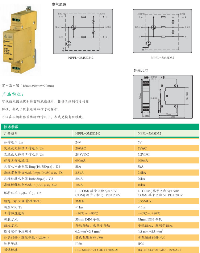 NPFL-3MSD52,NPFL-3MSD242,三線制通用型信號浪涌保護(hù)器(浮地)