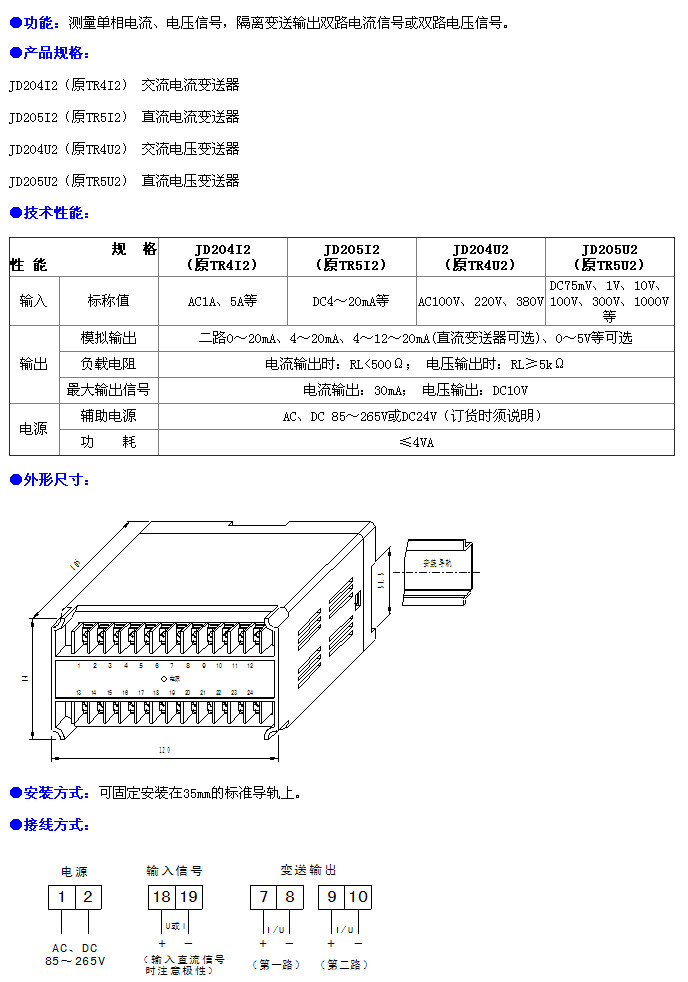 JD204I2,JD205I2,JD204U2,JD205U2,雙路電流/電壓變送器 JD204I2(原TR4I2) 交流電流變送器 JD205I2(原TR5I2) 直流電流變送器 JD204U2(原