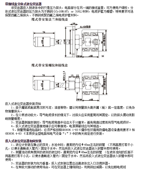 僅需將投入式液位變送器探頭投入液體中,引出信號線同二次儀表連接就可進行液位測量。