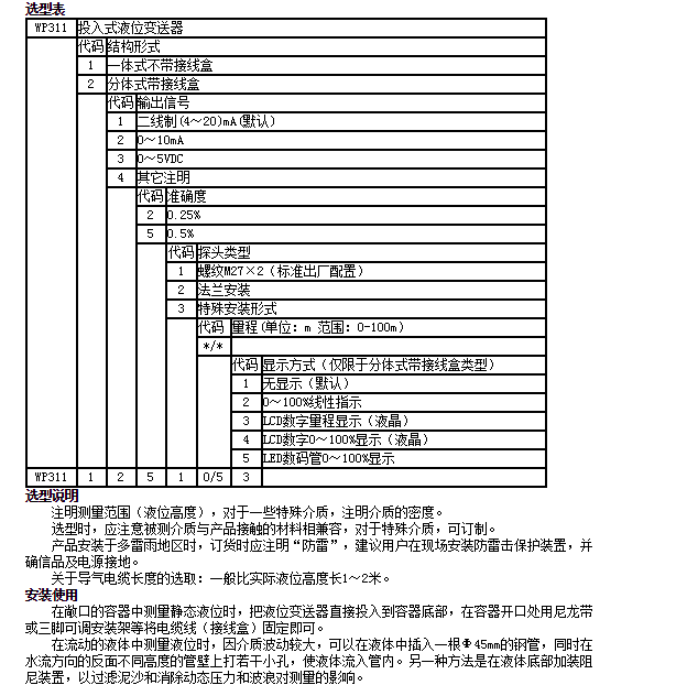 WP311型投入式液位變送器(也稱靜壓式液位變送器)選用進口帶防腐膜片敏感組件,將芯片裝入一個不銹鋼(或聚四氟乙烯)殼體內(nèi)。頂部的鋼帽起保護傳感器的作用,也能使被測液體流暢地接觸到膜片。該產(chǎn)品采用特制的通氣電纜,使感壓膜片的背壓腔與大氣良好相通,測量液位不受外界大氣壓變化的影響,測量準確,長期穩(wěn)定性好,并具有優(yōu)良的密封及防腐性能,符合船用標準,可直接投入到水、油等液體中長期使用。聚四氟乙烯材料的外殼及電纜可測量多種強腐蝕性液體。