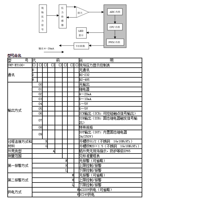 儀表通過壓力傳感器把壓力信號變?yōu)殡娦盘?,再由前置放大器把此電信號放大濾波,送往CPU的A/D轉(zhuǎn)換模塊進行模擬量到數(shù)字量的變換。最后由CPU進行數(shù)據(jù)處理并顯示及PWM輸出。原理框圖如下: