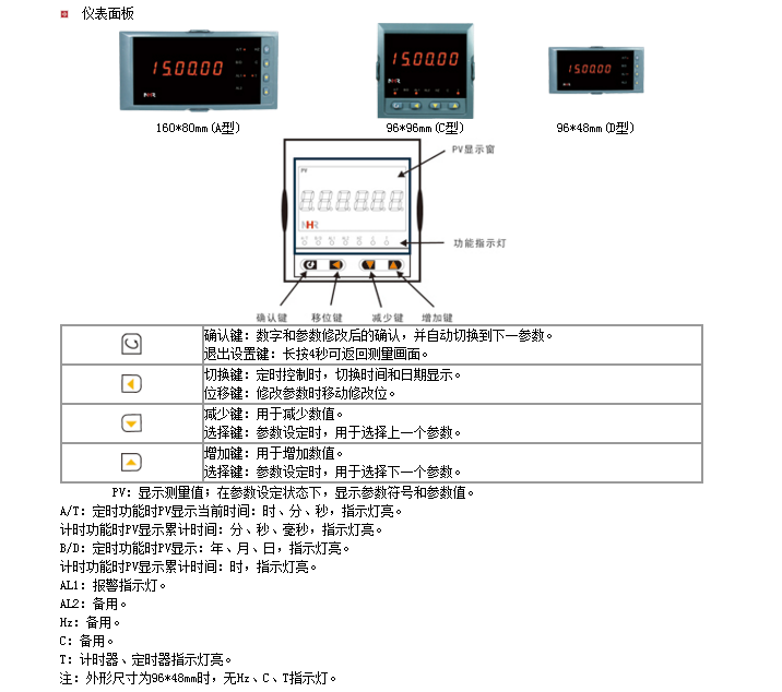 概述 NHR-2100/2200系列定時器/計時器采用全自動貼片封裝工藝,具有很強的抗干擾能力,并具有多種輸出功能和控制功能,廣泛運用于電力、石化、冶金、輕工、制藥、航空等諸多領域。 6位LED數(shù)碼顯示,顯示范圍寬,并且顯示亮度可以調(diào)整。 具備遞增和遞減兩種計時方式。 具備“定時報警”、“計時報警”功能,帶LED報警燈指示;計時報警時,可選200mS脈寬同步輸出,同時儀表將自動清零且停止報警,并重新開始計時。 支持RS485、RS232串行接口,采用標準MODBUS RTU通訊協(xié)議。 具備儀表按鍵啟動、停止、清零功能操作,也可外接啟動、停止、清零功能按鈕。 輸出、電源、通訊相互之間采用光電隔離技術。 具備多種外形尺寸及樣式供用戶選擇。 面板輕觸式按鍵設置,參數(shù)設置斷電永久保存。
