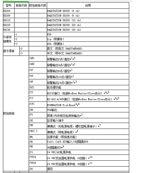 | *1 不能同時指定/AR1、/AR2和/A3。 *2 指定/AR1或/AR2后,不能指定/R1。 *3 指定/A3后,不能指定/F1。 *4 不能同時指定/C2、/C3和/CF1。 *5 使用Modbus Master功能,必須指定/M1。 *6 指定/CF1后,必須同時指定/M1。 *7 同時指定/P1和便攜式時,必須指定/H5不能同時指定/P1和/H5[ ]。 *8 /H5[D、F、R或J ] D:電源線UL、CSA標準 F:電源線VDE標準 R:電源線SAA標準 J:電源線BS標準 *9 不能對DX102和DX104指定/N2 *10指定/TPS2后,不能指定/TPS4,/AR2或/A3。 *11指定/TPS4后,不能指定/TPS2,/AR2,/A3或/F1。 |