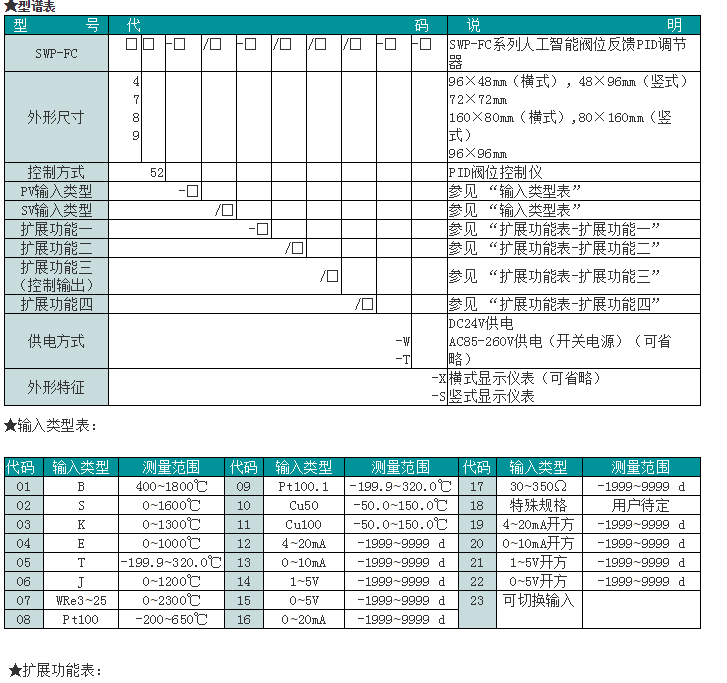 SWP-FC系列人工智能閥位控制PID調(diào)節(jié)器適用于需要進(jìn)行高精度測(cè)量控制的系統(tǒng),可取代放大器直接驅(qū)動(dòng)執(zhí)行的機(jī)構(gòu)(如閥位等),可對(duì)溫度、壓力、液位、速度等測(cè)量信號(hào)進(jìn)行數(shù)字量顯示控制(高亮度LED數(shù)碼顯示)及相對(duì)模擬量顯示(光柱顯示),使測(cè)量值的顯示更為清晰直觀。