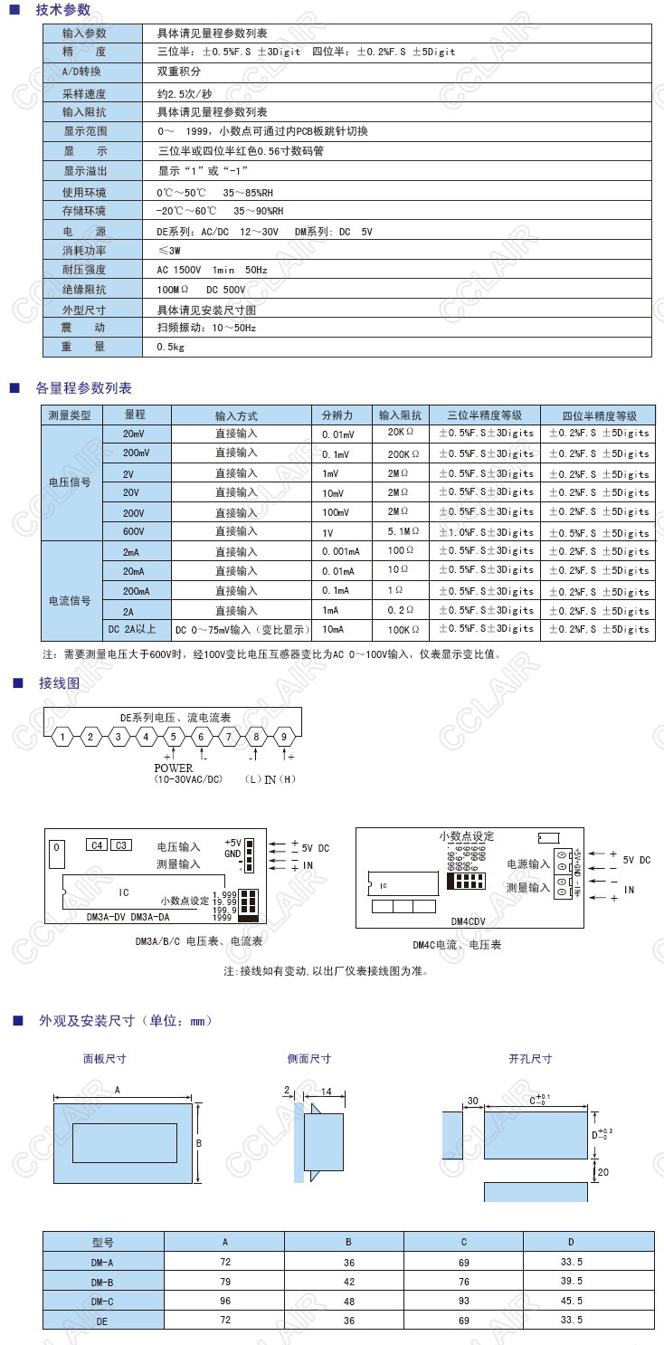 DE3A-DA2,DE3A-DA20,DE3A-DA200,DE3A-DV0.2,DE3A-DV2,DE3A三位半電壓電流表