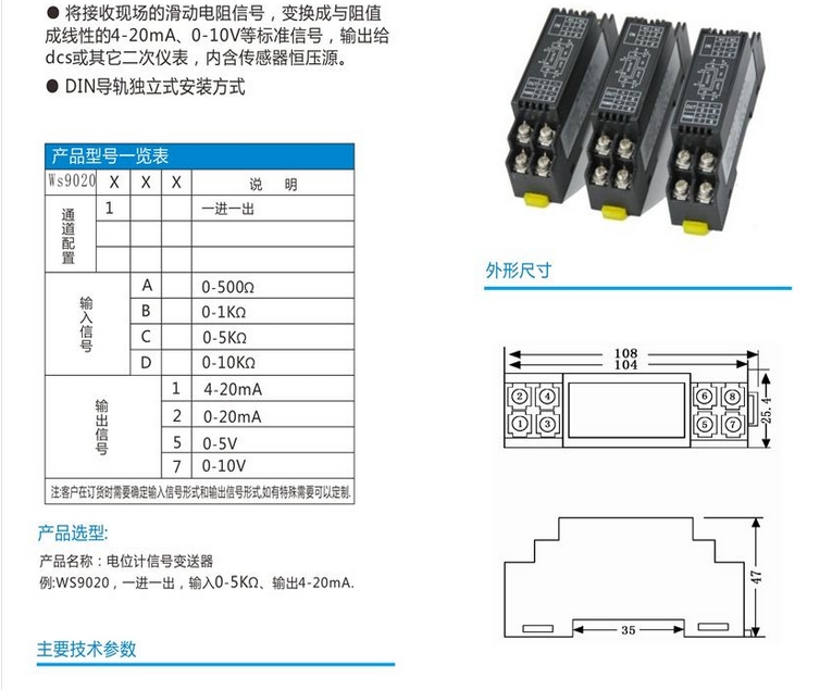 WS9020電位計(jì)變送器 電位計(jì)隔離器技術(shù)參數(shù)詳細(xì)介紹