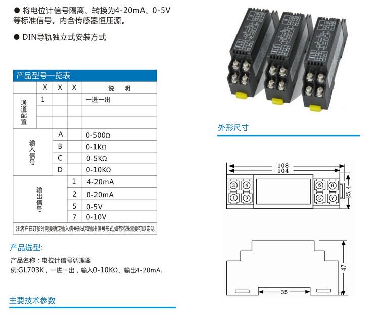 GL703K信號隔離調(diào)理器輸出范圍:0-20mA、4-20mA、0-5V、0-10V等用戶需要的標(biāo)準(zhǔn)信號