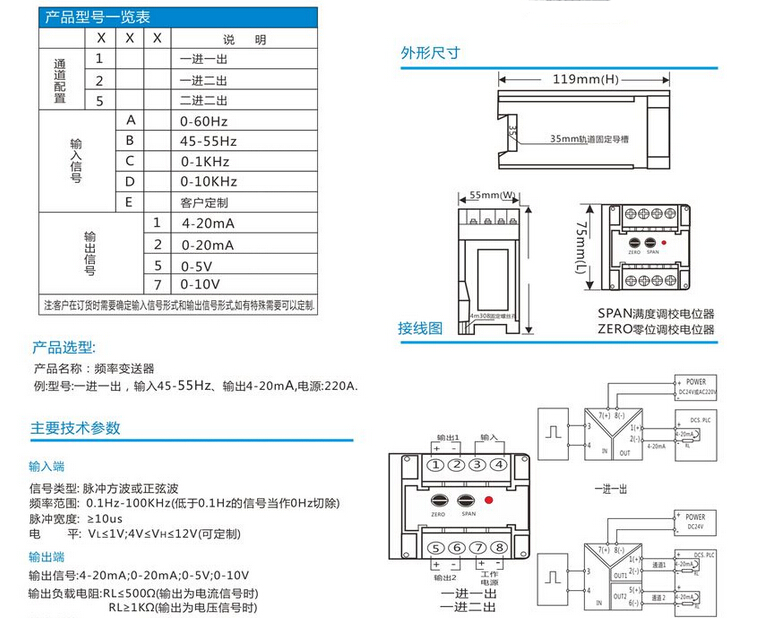 JD20F頻率變送器輸出范圍:DC4-20mA、0-20mA、0-5V、0-10V、1-5V等用戶需要的標準信號