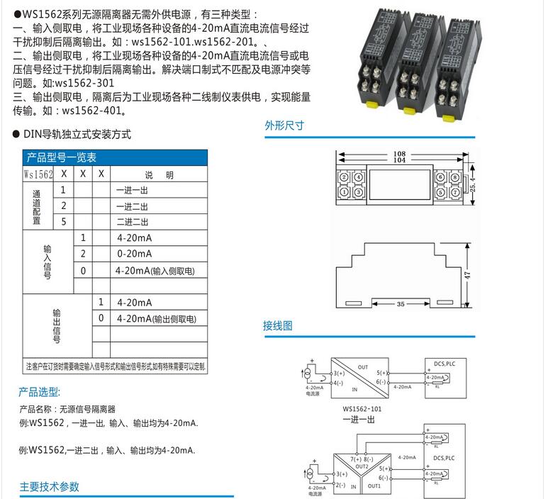 WS1562信號(hào)隔離器,無(wú)源過(guò)程電流信號(hào)隔離器4-20mA 0-20mA無(wú)需外接電源,輸入輸出隔離傳輸精度高,DIN T型導(dǎo)軌安裝