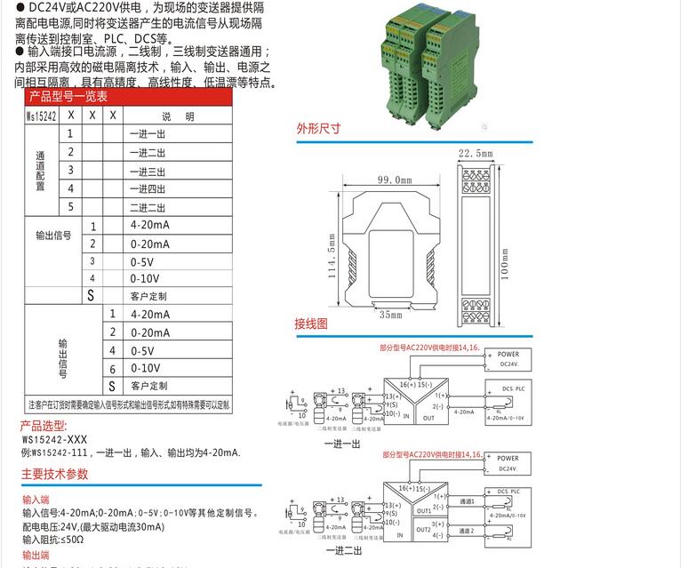 WS15242全隔離雙輸出信號分配器,將輸入信號變換為兩路相互隔離的信號,低功耗,低熱量,低漂移,DIN T型導(dǎo)軌安裝