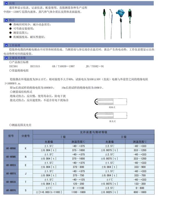 通常和顯示儀表、記錄儀表等配套使用。直接測量各種生產(chǎn)過程中的0~1300℃范圍內(nèi)液體、蒸汽和氣體介質(zhì)以及固體表面溫度。