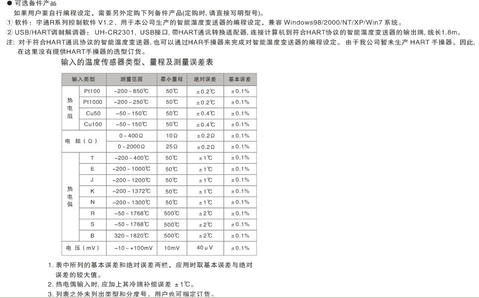 標(biāo)準(zhǔn)精度:±0.1%(參見溫度傳感器類型、量程及測量誤差表)