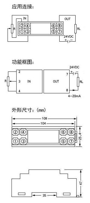 電位計(jì)輸入 二線(xiàn)制4-20mA輸出;內(nèi)含傳感器恒壓源;DIN T型導(dǎo)軌安裝