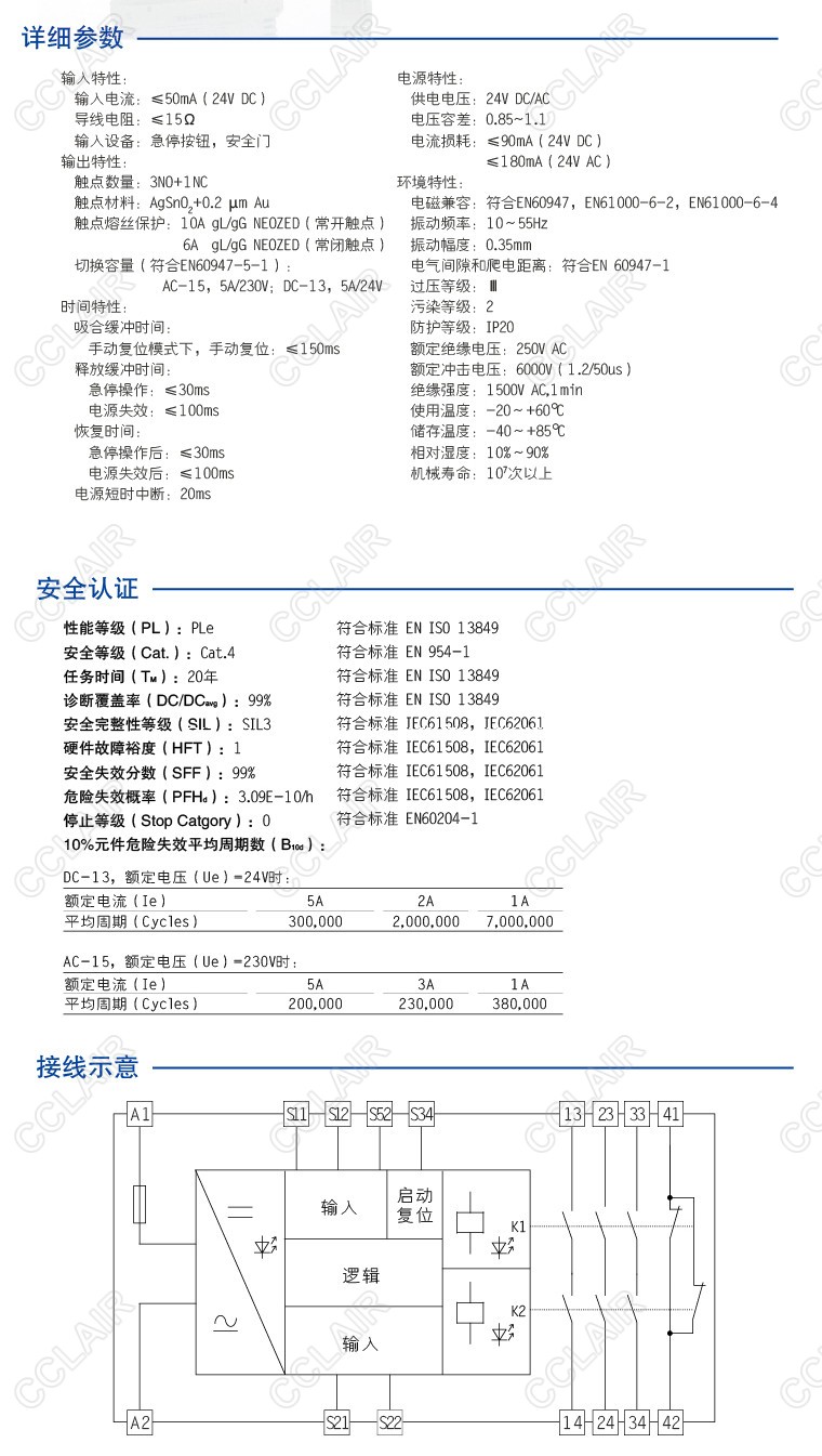 CZSR8001-3A1B(M)是適用于急停按鈕、安全門控開關(guān)輸入,具有3路NO(常開)安全輸出觸點和1路NC(常閉)輔助輸出觸點的安全繼電器。它可選擇單、雙通道操作,手動復(fù)位,并具有通道間短路監(jiān)控,復(fù)位按鈕監(jiān)控功能。