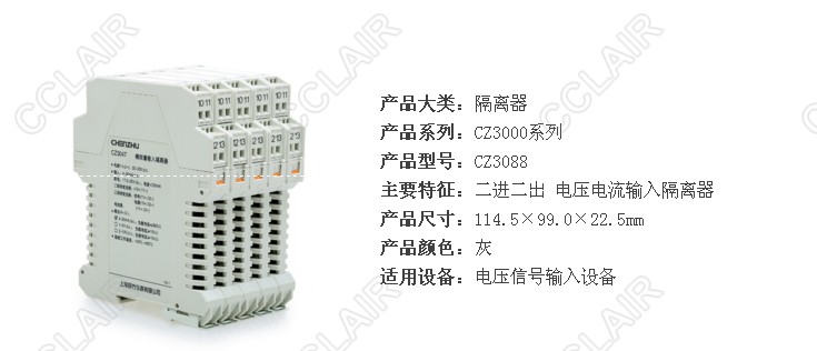 CZ3088 二進(jìn)二出 電壓電流輸入隔離器 二進(jìn)二出,支持多種電壓電流信號(hào)輸入,多種電壓電流信號(hào)輸入 可向現(xiàn)場(chǎng)儀表提供隔離電源 CZ3089 一進(jìn)二出 電壓電流輸入隔離器 一進(jìn)二出,支持多種電壓電流信號(hào)輸入,多種電壓電流信號(hào)輸入 可向現(xiàn)場(chǎng)儀表提供隔離電源