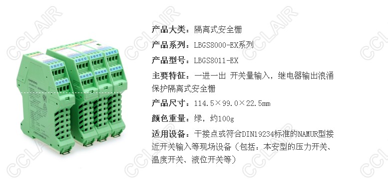 具有防雷擊浪涌保護功能的開關量輸入,繼電器輸出安全柵。它的功能是接收來自危險區(qū)的開關和接近開關輸入,通過安全柵隔離傳輸?shù)桨踩珎壤^電器輸出。它具有輸入斷線檢測報警及輸入輸出反相設置功能。該產品需要獨立供電,電源、輸入和輸出三隔離。