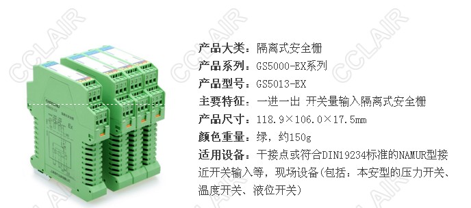 開關(guān)量輸入隔離式安全柵,接收來自危險(xiǎn)區(qū)的干接點(diǎn)或符合DIN19234標(biāo)準(zhǔn)的NAMUR型接近開關(guān)輸入, 通過安全柵隔離傳輸?shù)桨踩珔^(qū)晶體管輸出,它具有輸入斷線檢測(cè)報(bào)警指示及輸入輸出反相設(shè)置功能。該產(chǎn)品需要獨(dú)立供電,電源、輸入和輸出三隔離。