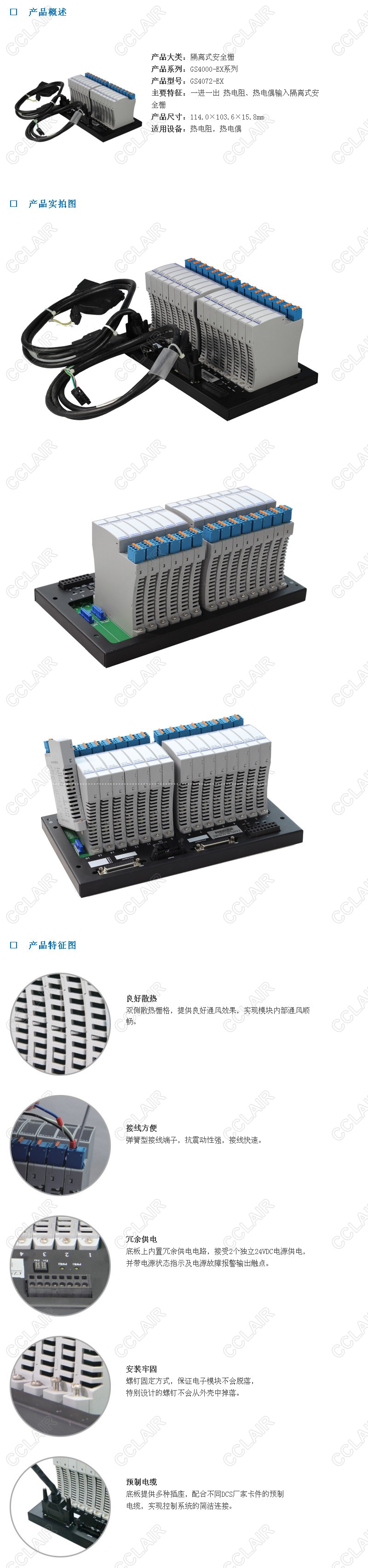 GS4072-EX熱電阻、熱電偶輸入型底板式隔離柵,將現(xiàn)場的熱電阻、熱電偶信號轉(zhuǎn)換成0/4~20mA或1~5V信號,從危險側(cè)隔離傳輸?shù)桨踩珎?cè)。它具有冷端補償?shù)墓δ?,是智能型安全柵,可通過計算機對熱電偶的分度號、量程范圍等進行組態(tài),同時可對上下限及斷線報警輸出電流值進行設定。該產(chǎn)品需要獨立供電,電源、輸入和輸出三隔離。