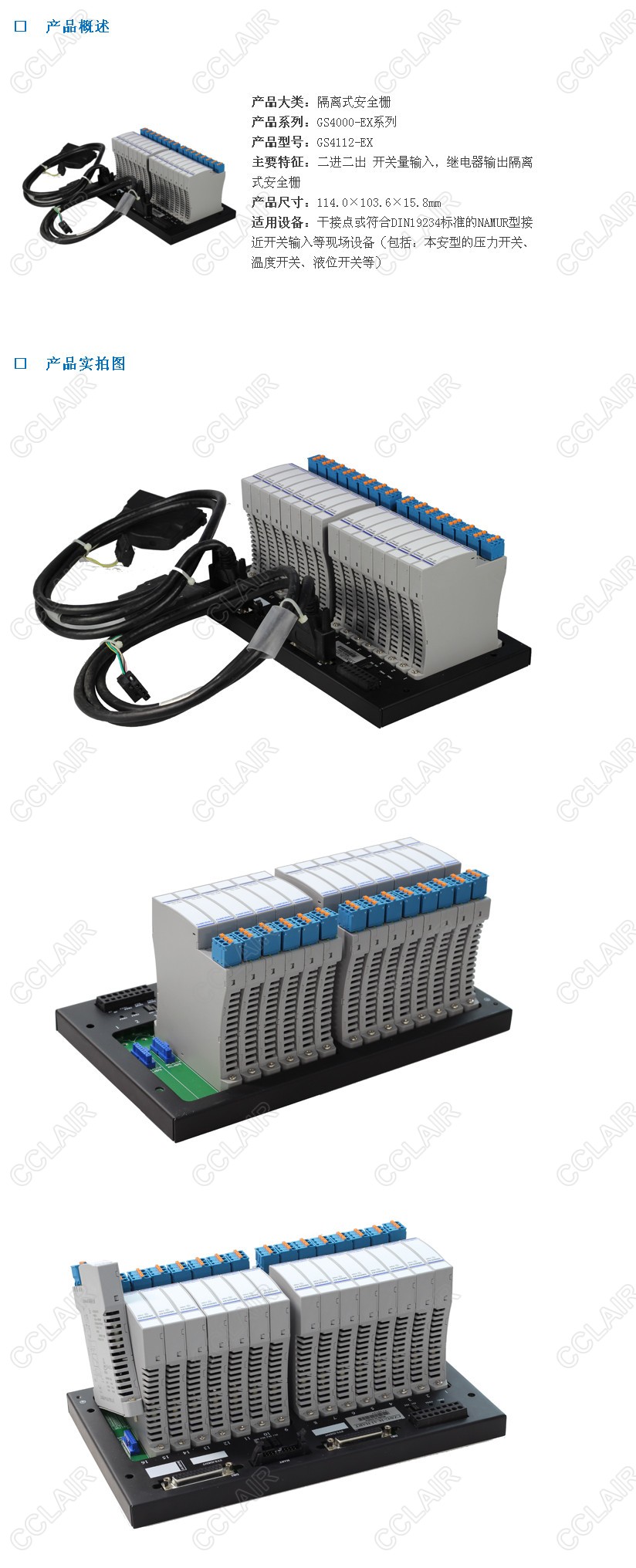 GS4112-EX為開關(guān)量輸入,繼電器輸出隔離柵,接收來自危險區(qū)的干接點開關(guān)或NAMUR接近開關(guān)輸