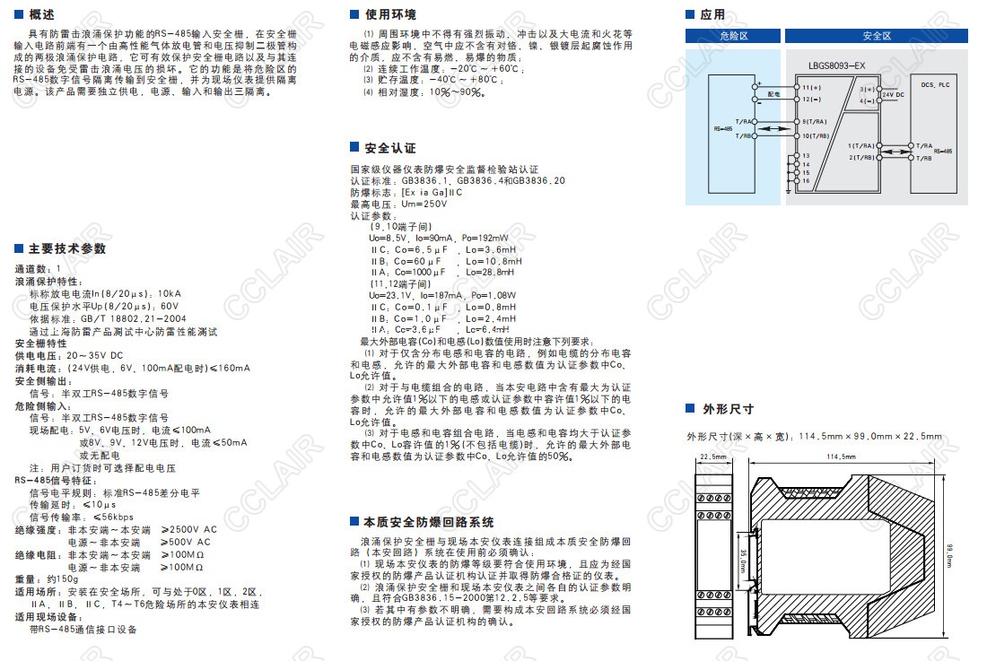 具有防雷擊浪涌保護功能的RS-485輸入安全柵。它的功能是將危險區(qū)的RS-485數(shù)字信號隔離傳輸?shù)桨踩珔^(qū),并為現(xiàn)場儀表提供隔離電源。該產品需要獨立供電,電源、輸入和輸出隔離。