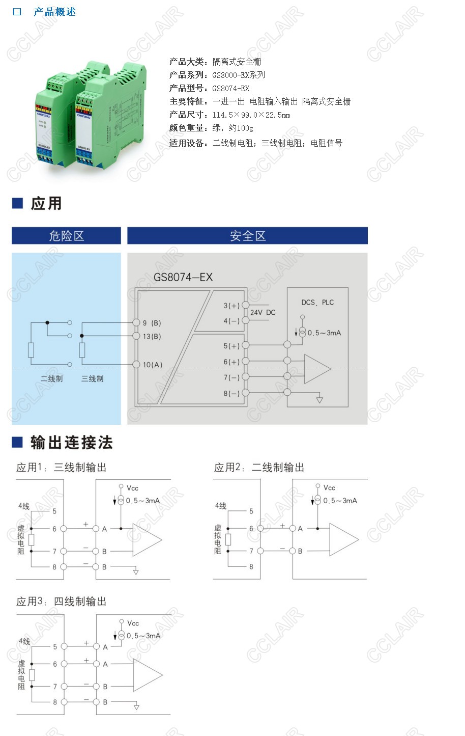 電阻輸入、電阻輸出隔離式安全柵,將現(xiàn)場二線制、三線制電阻信號1:1隔離傳輸?shù)桨踩珎?cè)輸出。該產(chǎn)品需要獨立供電,電源、輸入和輸出三隔離。