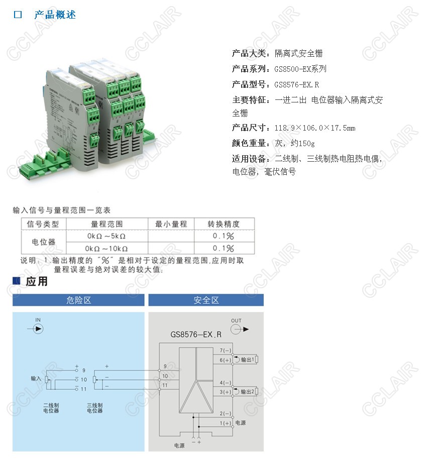 隔離式安全柵,將現(xiàn)場(chǎng)的熱電阻、熱電偶、毫伏信號(hào)、電位器信號(hào)轉(zhuǎn)換成0/4~20mA的電流信號(hào)或0~5V電壓信號(hào),從危險(xiǎn)區(qū)隔離傳送到安全區(qū)。它具有冷端補(bǔ)償功能,是智能型的,可通過(guò)計(jì)算機(jī)對(duì)熱電阻、熱電偶、電位器的分度號(hào)、量程范圍等進(jìn)行組態(tài)。該產(chǎn)品需要獨(dú)立供電,電源、輸入和輸出的三隔離。