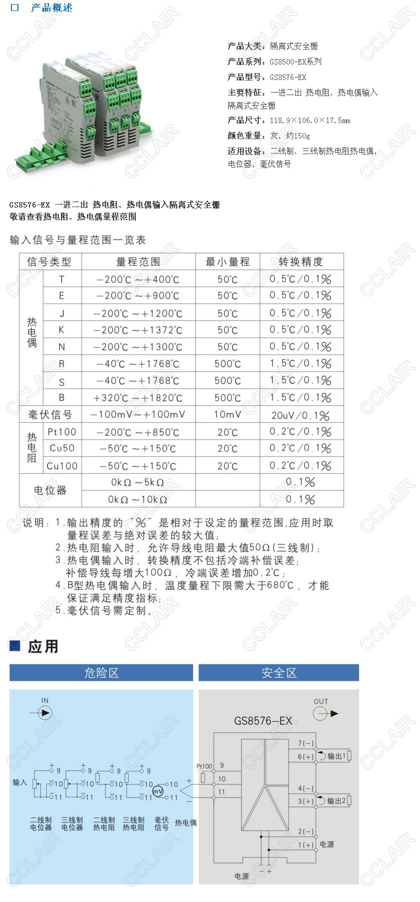隔離式安全柵,將現(xiàn)場的熱電阻、熱電偶、毫伏信號、電位器信號轉(zhuǎn)換成0/4~20mA的電流信號或0~5V電壓信號,從危險區(qū)隔離傳送到安全區(qū)。它具有冷端補償功能,是智能型的,可通過計算機對熱電阻、熱電偶、電位器的分度號、量程范圍等進行組態(tài)。該產(chǎn)品需要獨立供電,電源、輸入和輸出的三隔離。