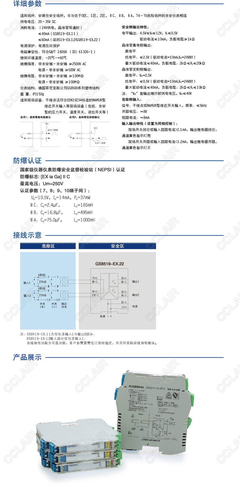 GS8519-EX.22 二進(jìn)二出 開(kāi)關(guān)量輸入,晶體管輸出隔離式安全柵