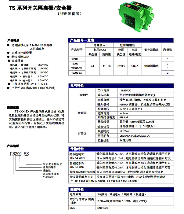 | TS200-EX | 開關(guān)量檢測端隔離式安全柵 | NAMUR傳感器、機(jī)械觸點(diǎn)等開關(guān)狀態(tài) | 繼電器輸出 | 2進(jìn)2出 | 五端隔離; 正反相控制設(shè)置 斷線檢測功能 |