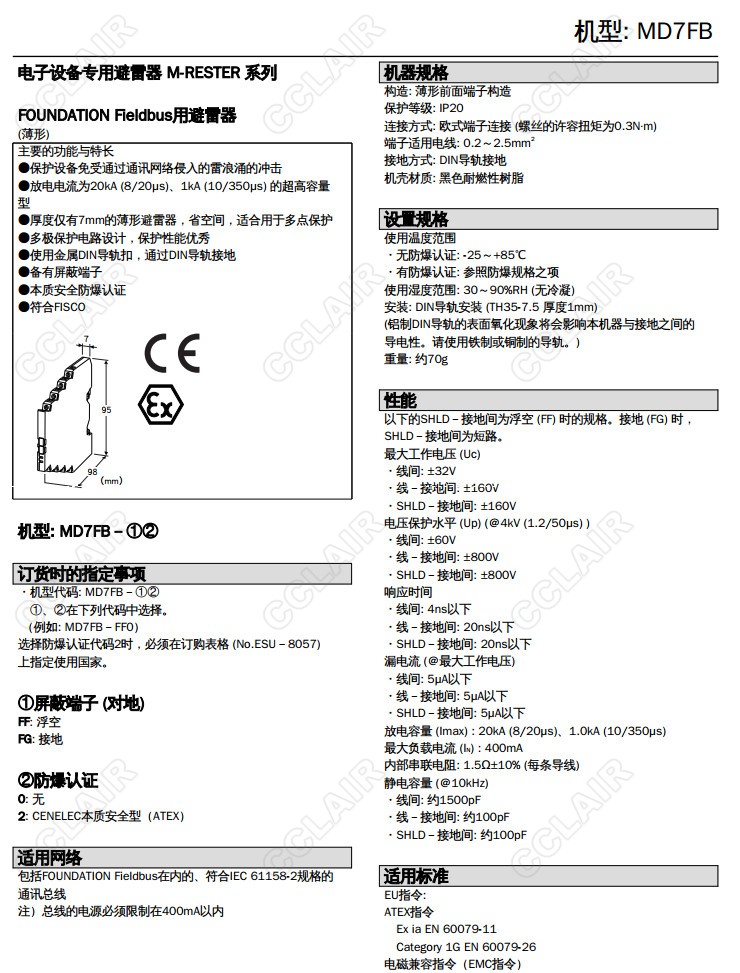 MD7FB,MD7FB-FF0,MD7FB-FG0,MD7FB-FG0,MD7FB-FG2, FOUNDATION Fieldbus用 超薄型避雷器