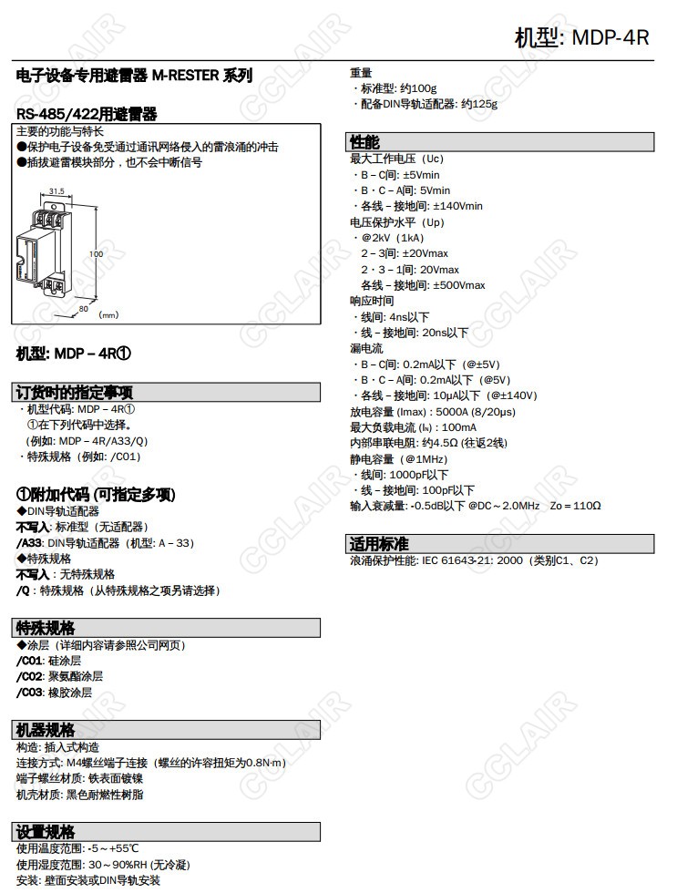 MDP-4R,MDP-4R/A33,MDP-4R/Q, RS-485/RS-422用 插入型避雷器