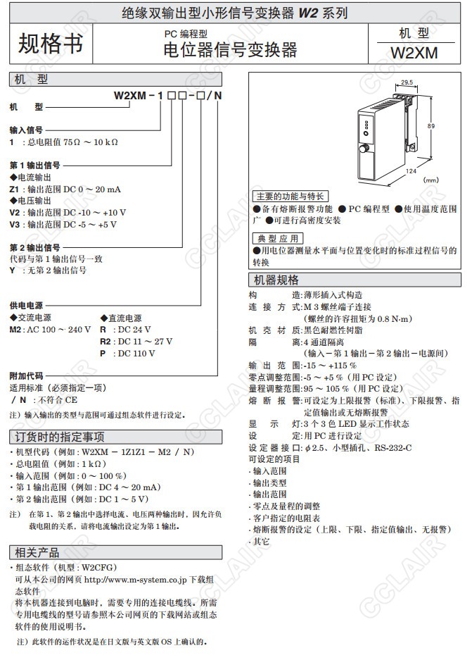 W2XM,W2XM-1Z1Z1-M2/N,W2XM-1V2,W2XM-1V3,電位器信號變換器(PC編程型)
