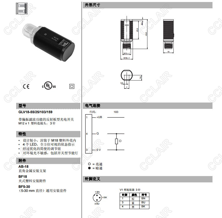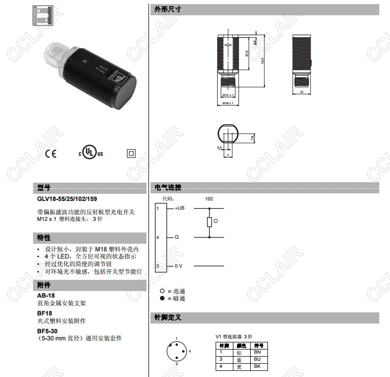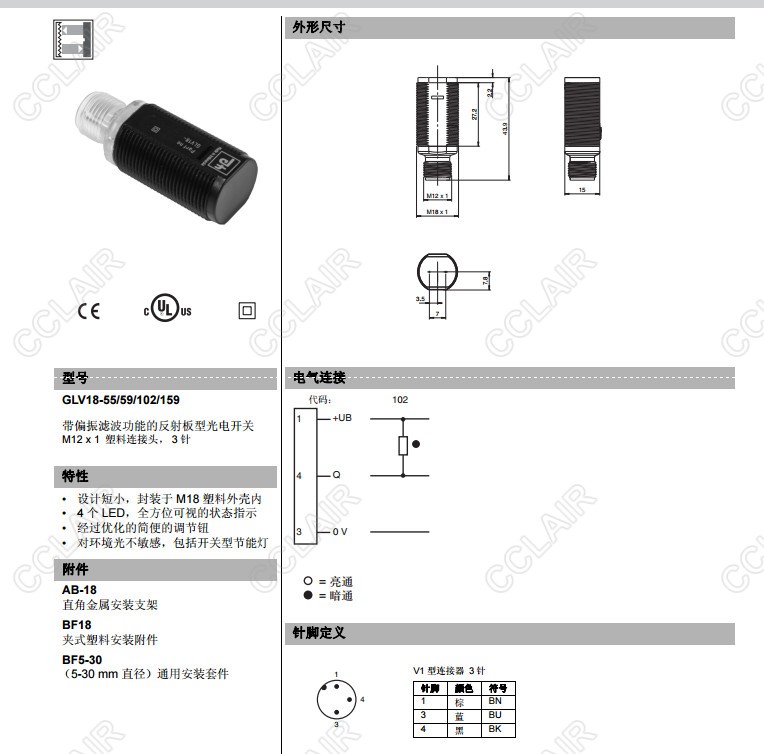 GLV18-55/25/102/159,GLV18-55/25/103/159,GLV18-55/59/102/159,反射板型傳感器