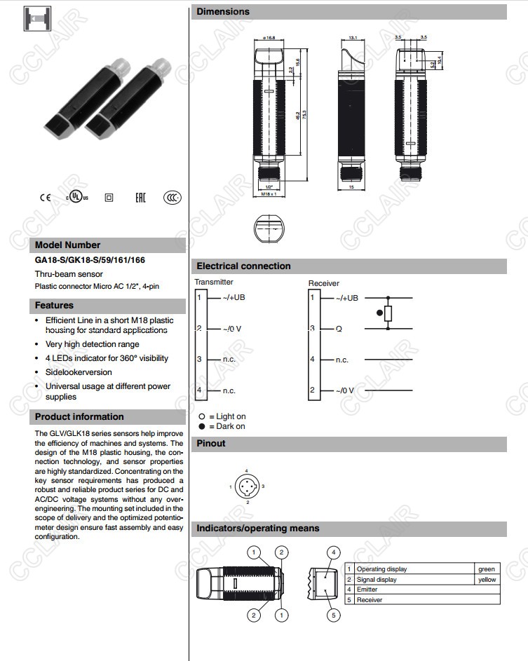 GA18-S/GK18-S/59/161/166,對射型傳感器