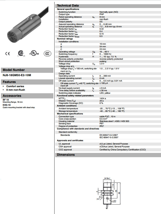 NJ8-18GM50-E2-10M電感式接近開關(guān)
