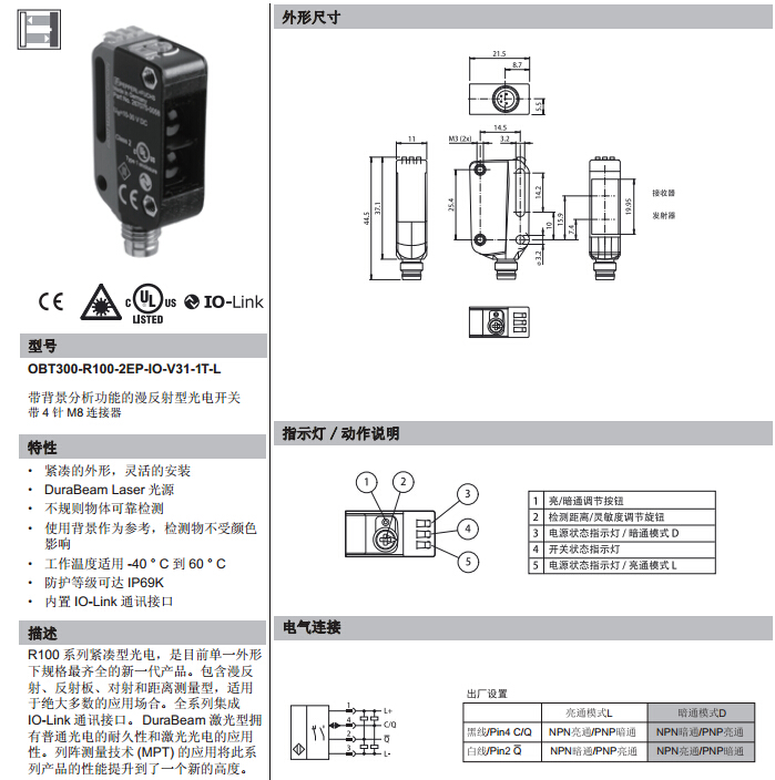 OBT300-R100-2EP-IO-V31-1T-L,漫反射型傳感器